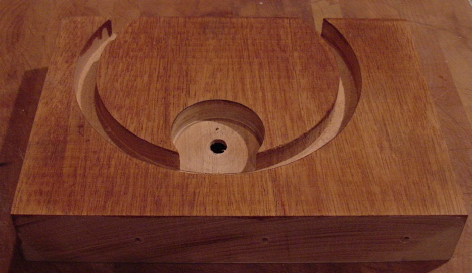 A variety of chain paths and spout geometries were tried. At first, I routed square "races" in which the chain traveled, and trapped the chain in place with plexiglass, but eventually I started to route out channels with a circular cross-section to eliminate the glare of the plexiglass.